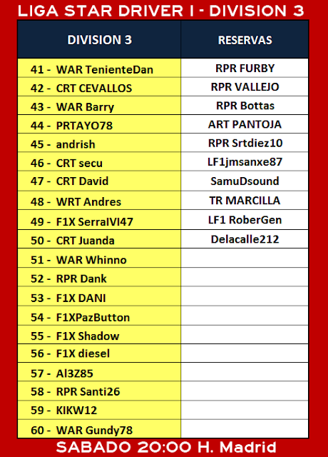 * LIGA STAR DRIVER I - FORMULA 1 XBOX * DIVISION 3 * Hoy Sabado 30-05-2020 * GP DO BRASIL * 20:00 H. Madrid * DIRECTO */ DIVISION 2 * 22:30 Hora Madrid * DIRECTO *